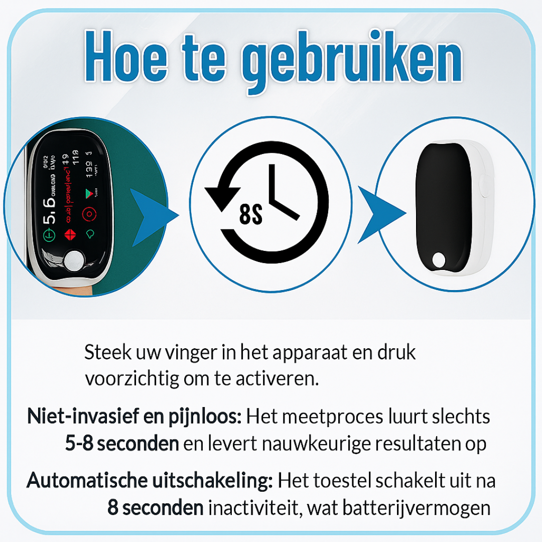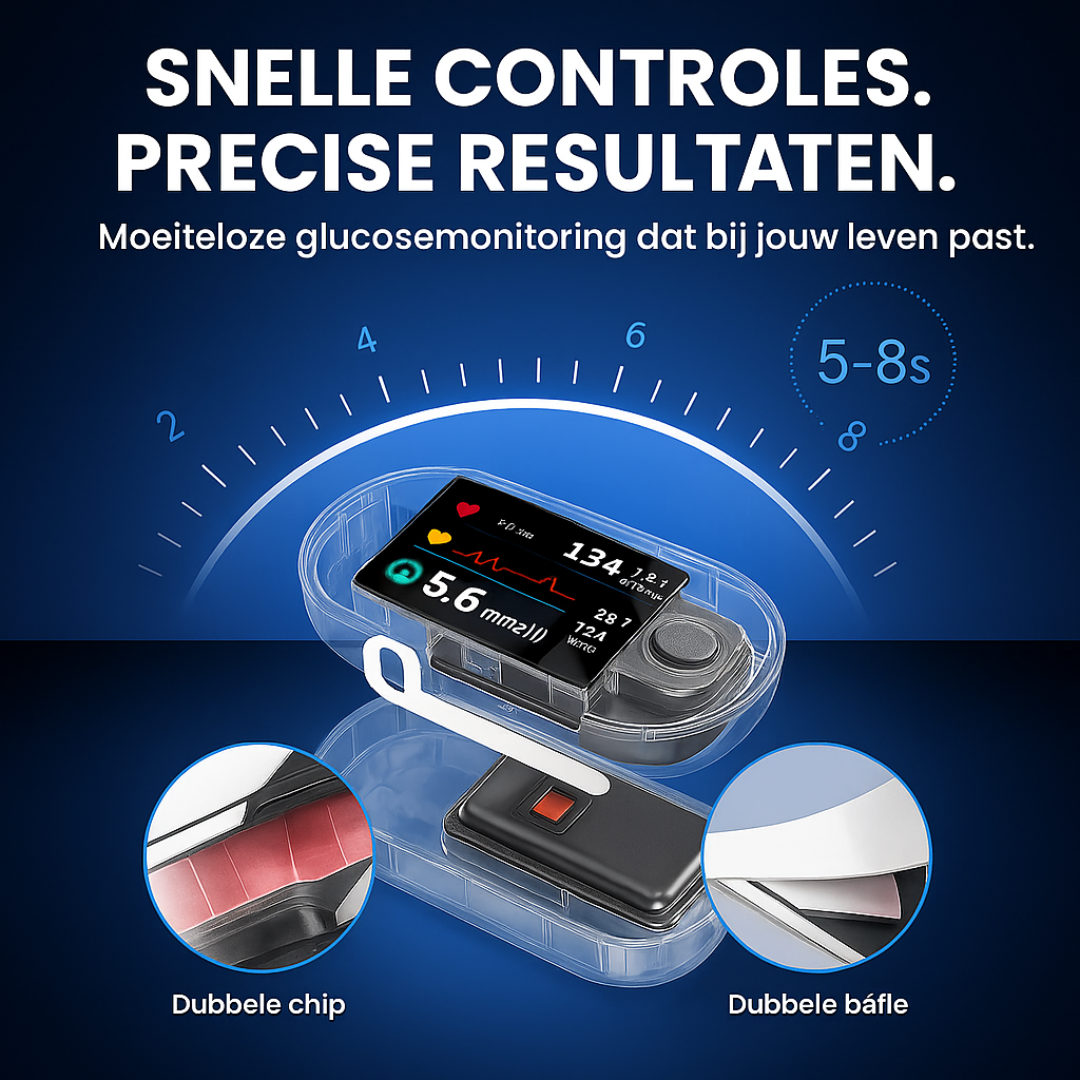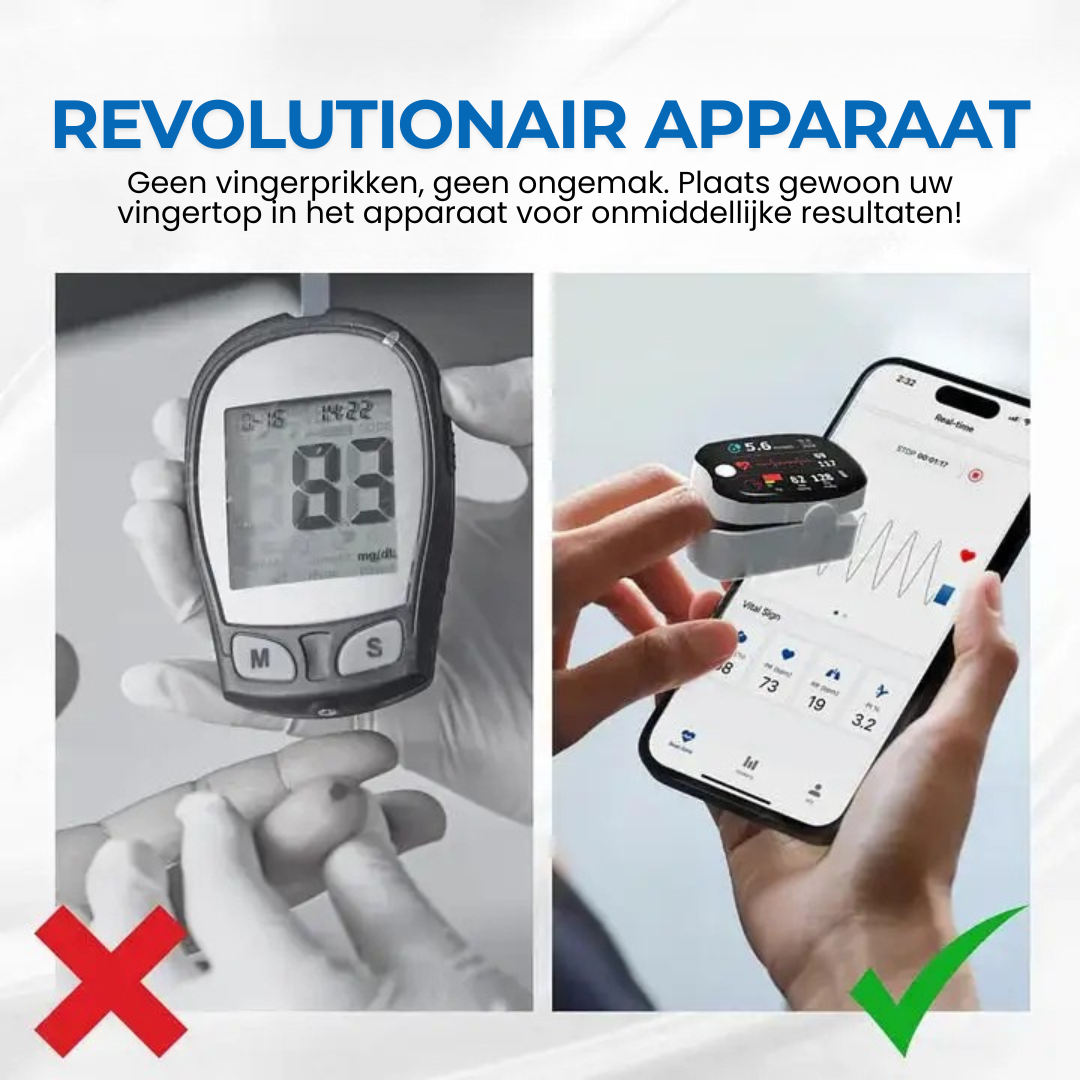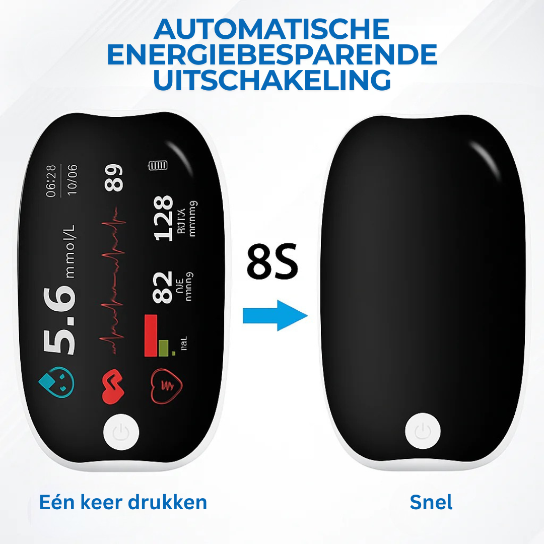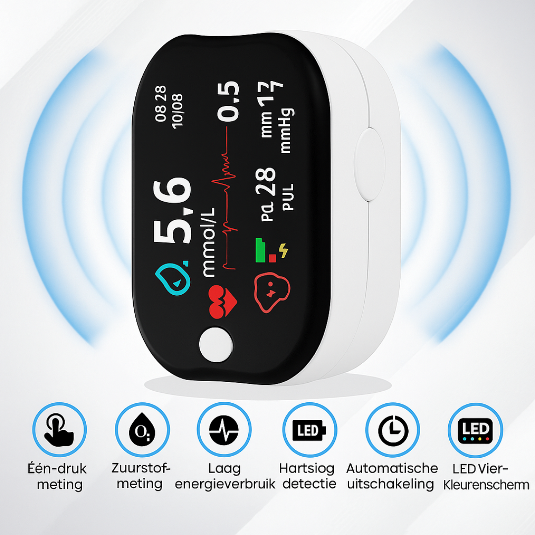 Dankzij het compacte ontwerp en de eenvoudige éénknopsbediening is GlucoSense ideaal voor gebruik in huis. Meet moeiteloos je bloedsuiker, bloeddruk, zuurstofgehalte én hartslag – alles in één apparaat, zonder artsbezoek of wachttijd.