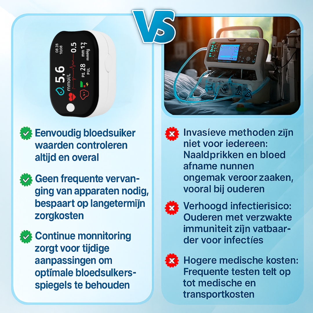 Zeg vaarwel tegen pijnlijke vingerprikken, dure strips en ingewikkelde meters. GlucoSense biedt een zachte, veilige en niet-invasieve oplossing voor dagelijkse glucosecontrole. Geen bloed, geen gedoe – gewoon op een natuurlijke manier je gezondheid monitoren.