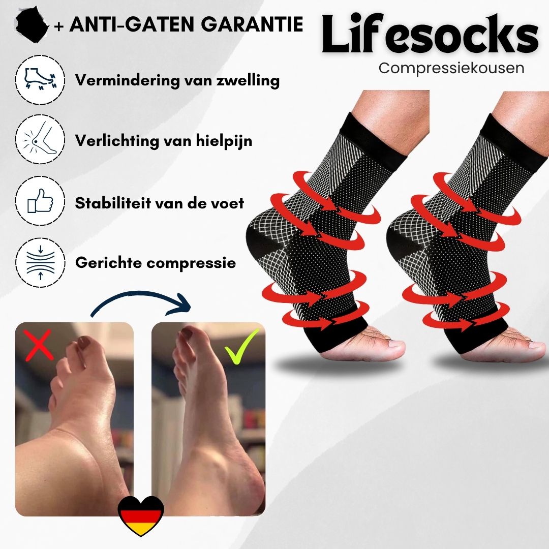 LifeSocks gebruiken de technologie van de Compressiezone, pijn en ontsteking, klachten in verband met gezwollen voeten worden snel ontlast. Het stevige, elastische weefsel oefent nauwkeurige druk uit op de voetspieren, waardoor vrijwel onmiddellijk verlichting wordt geboden.