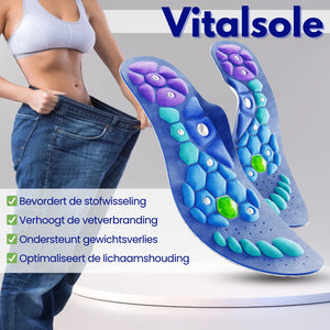 De Vitalsole-inlegzolen zijn ontwikkeld om een actieve levensstijl te stimuleren en gewichtsverlies moeiteloos te ondersteunen. Hun unieke acupressuur technologie stimuleert belangrijke drukpunten en helpt de stofwisseling en vetverbranding te activeren.